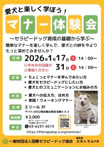 セラピードッグ育成の基礎をもとに、愛犬といっしょに、わいわい楽しくマナーを学べる場です!皆様のご参加をお待ちしております。