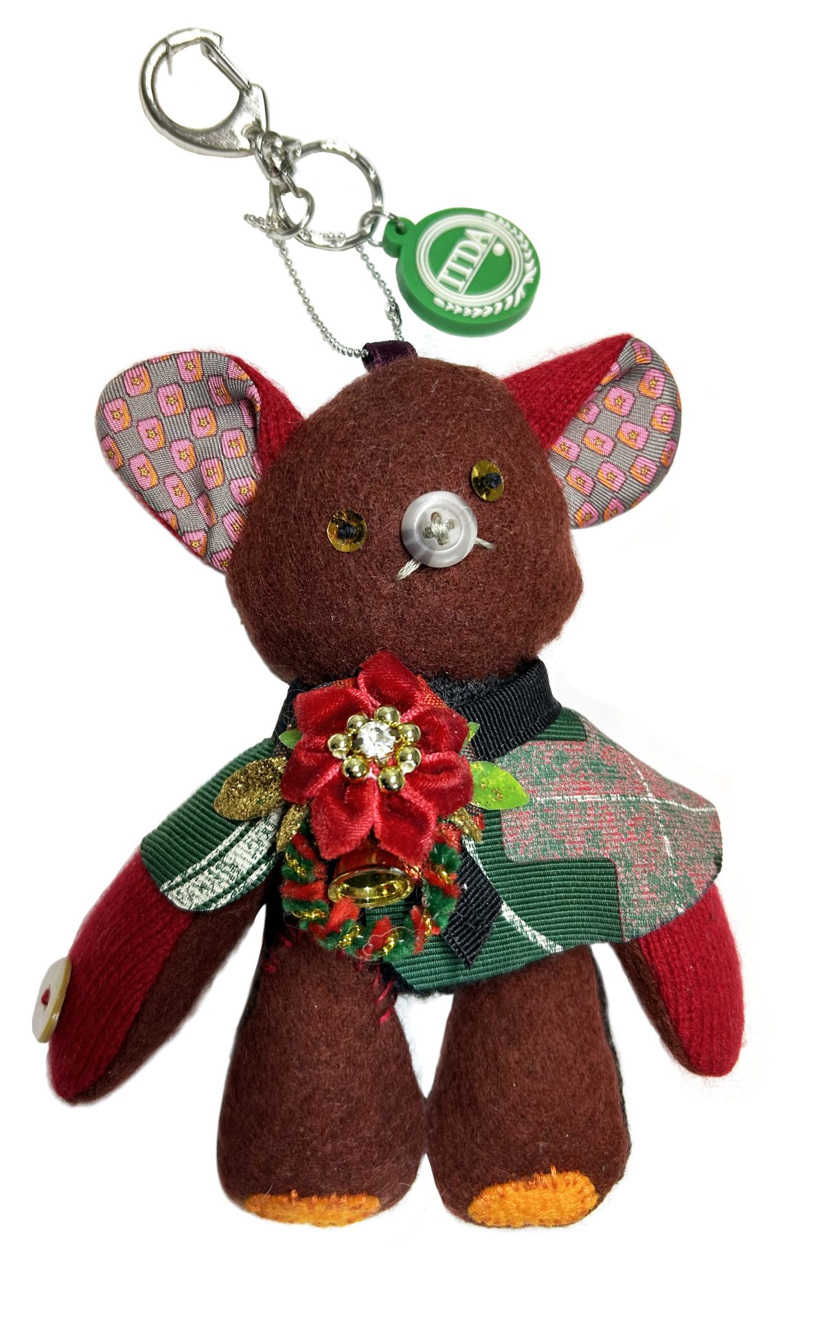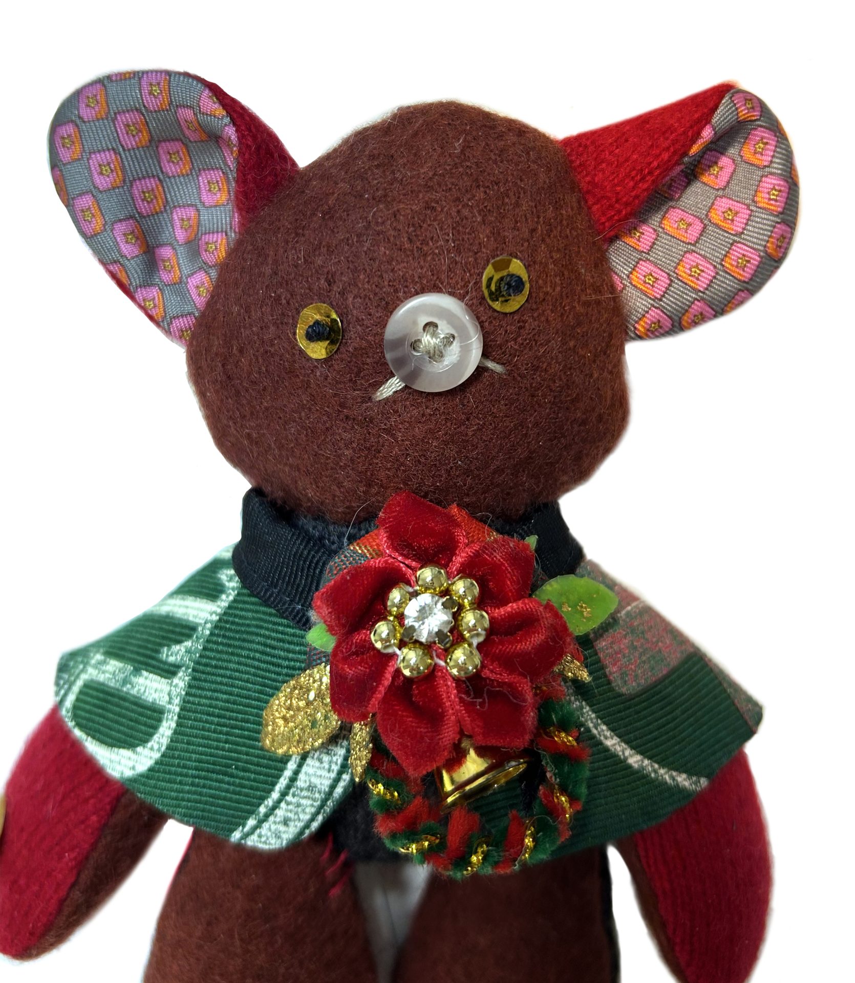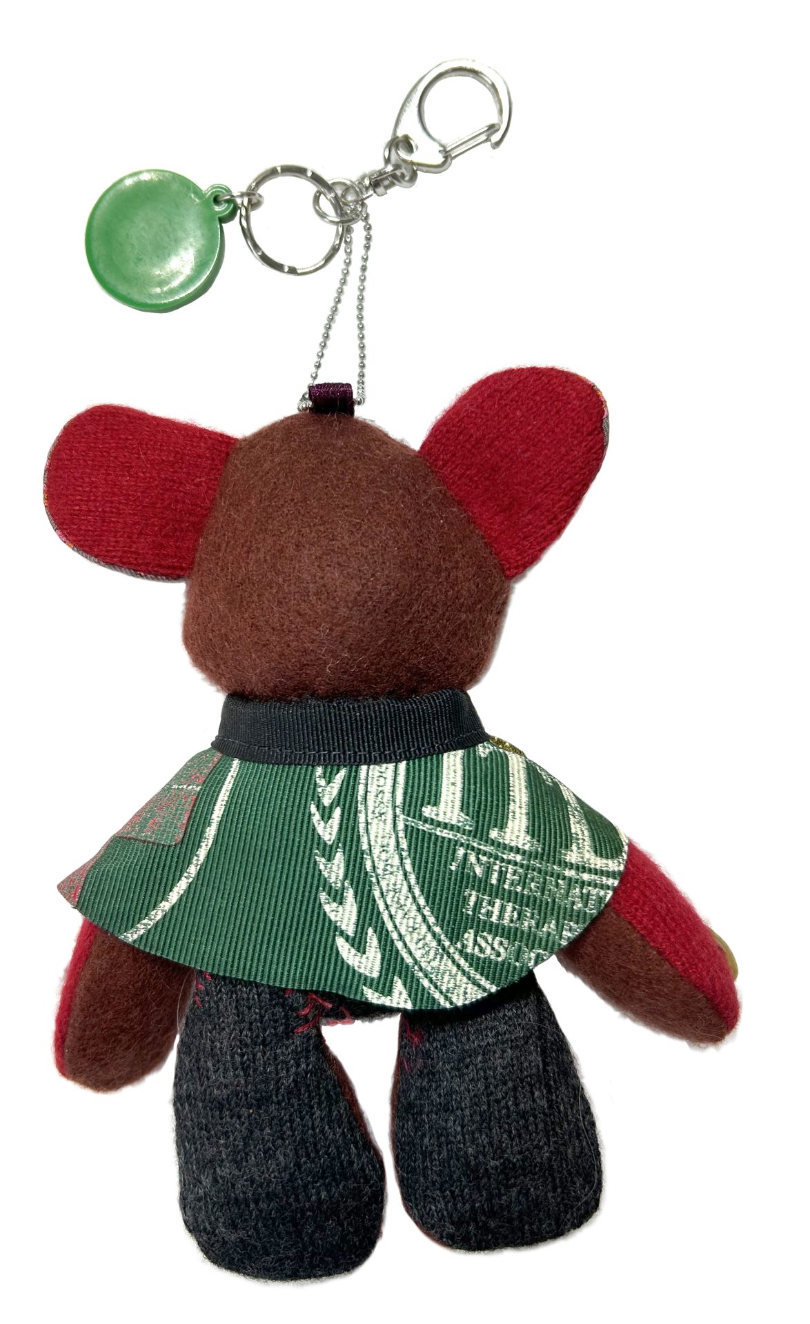 大木トオルさんのカシミヤのセーター2種類とリブセーターを本体に、耳の内側にはプリントのシルクネクタイを、鼻はシャツのボタンを使っています。右腕にはサマーシャツから取った貝ボタンを付けました。