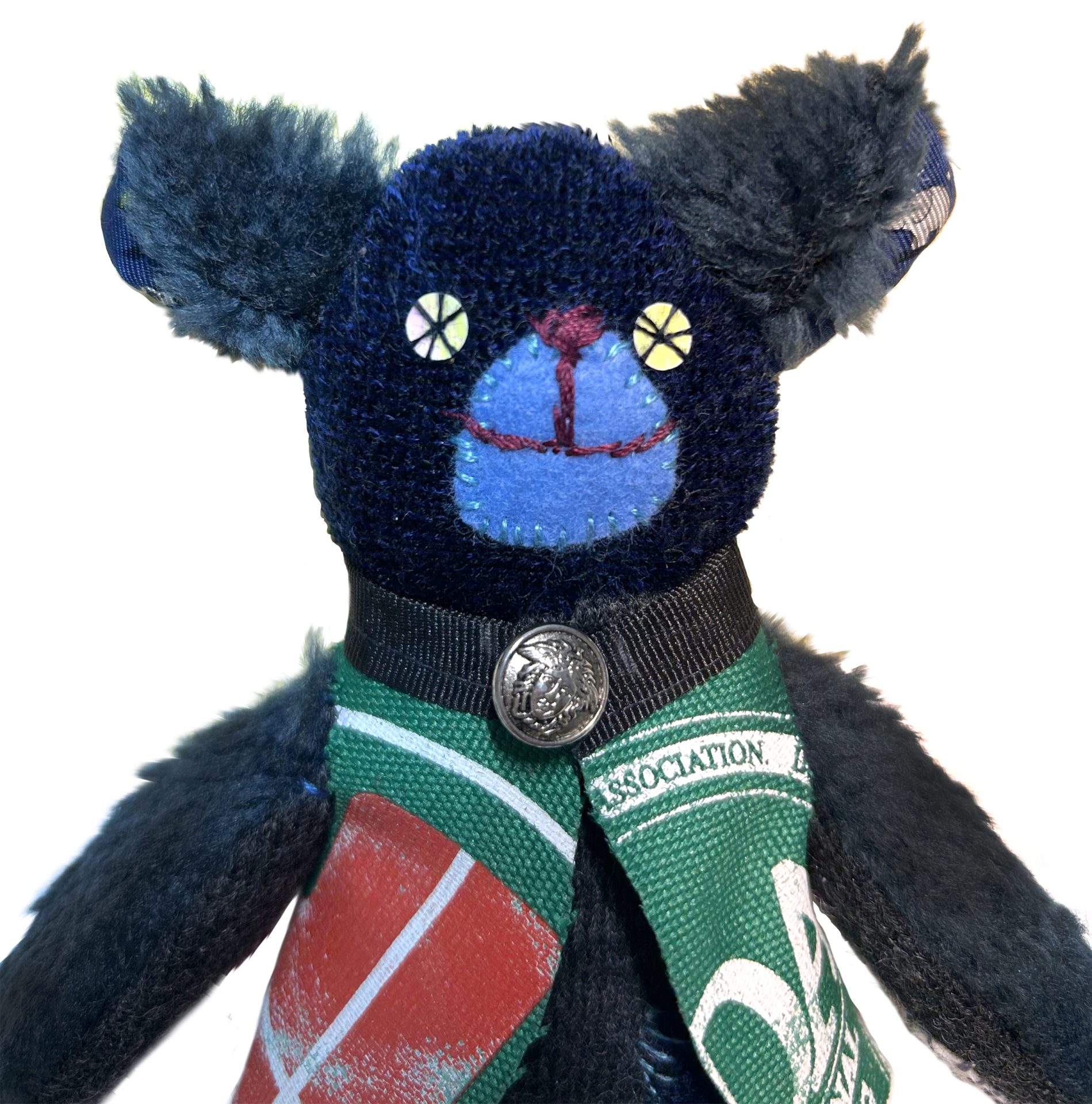 大木トオルさんのルームガウンを本体に、お茶目な動物プリントのネクタイを耳の内側に使いました。