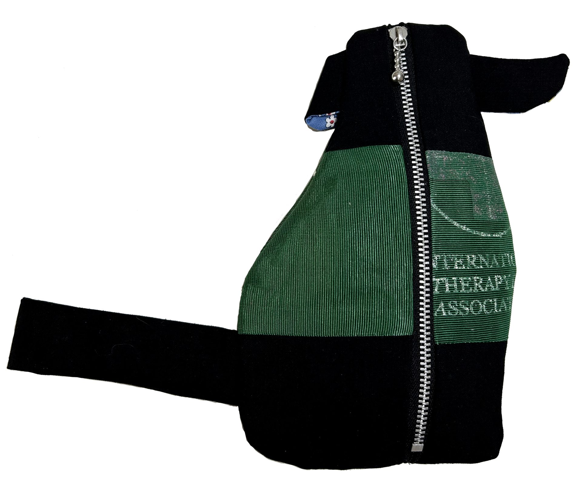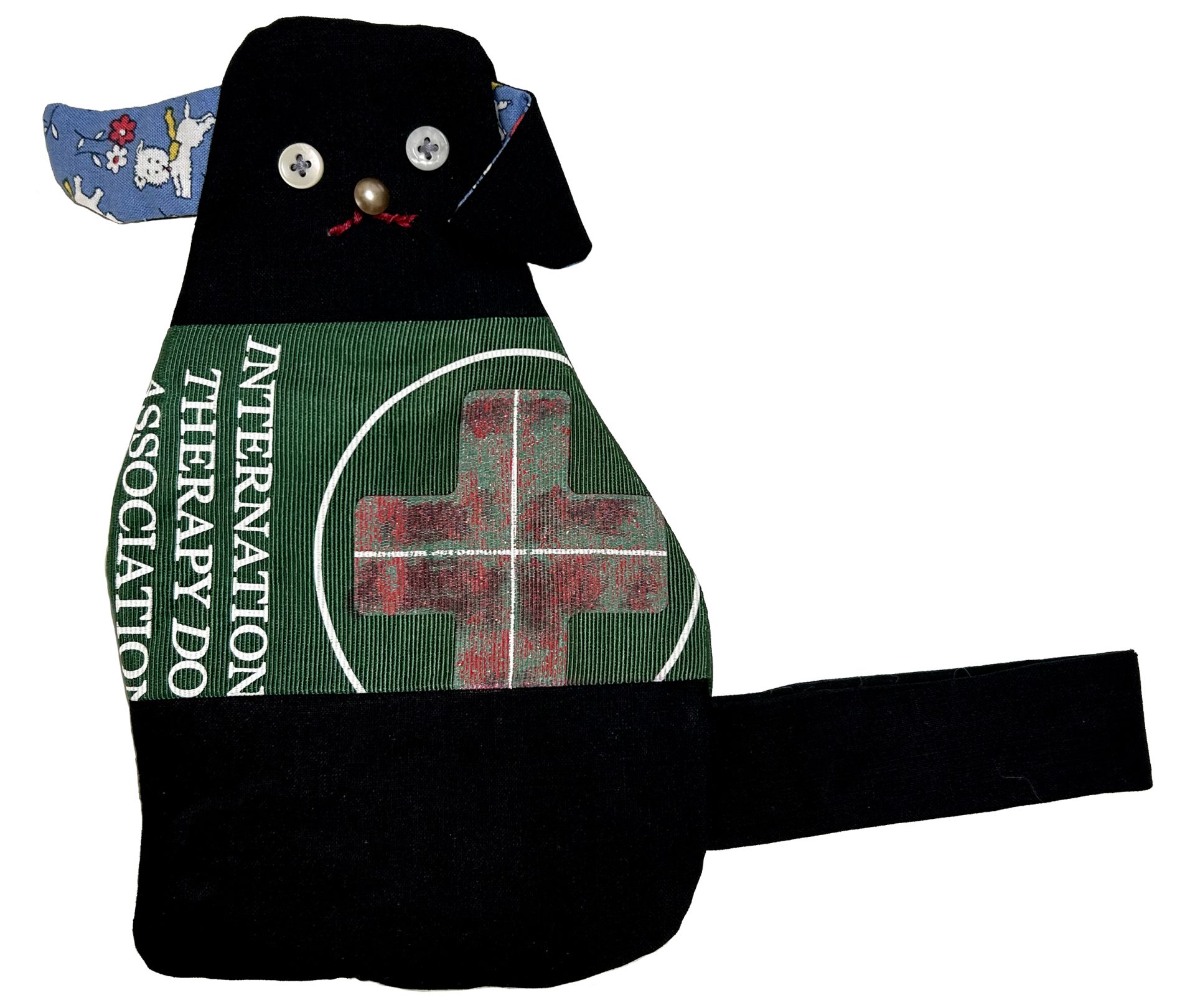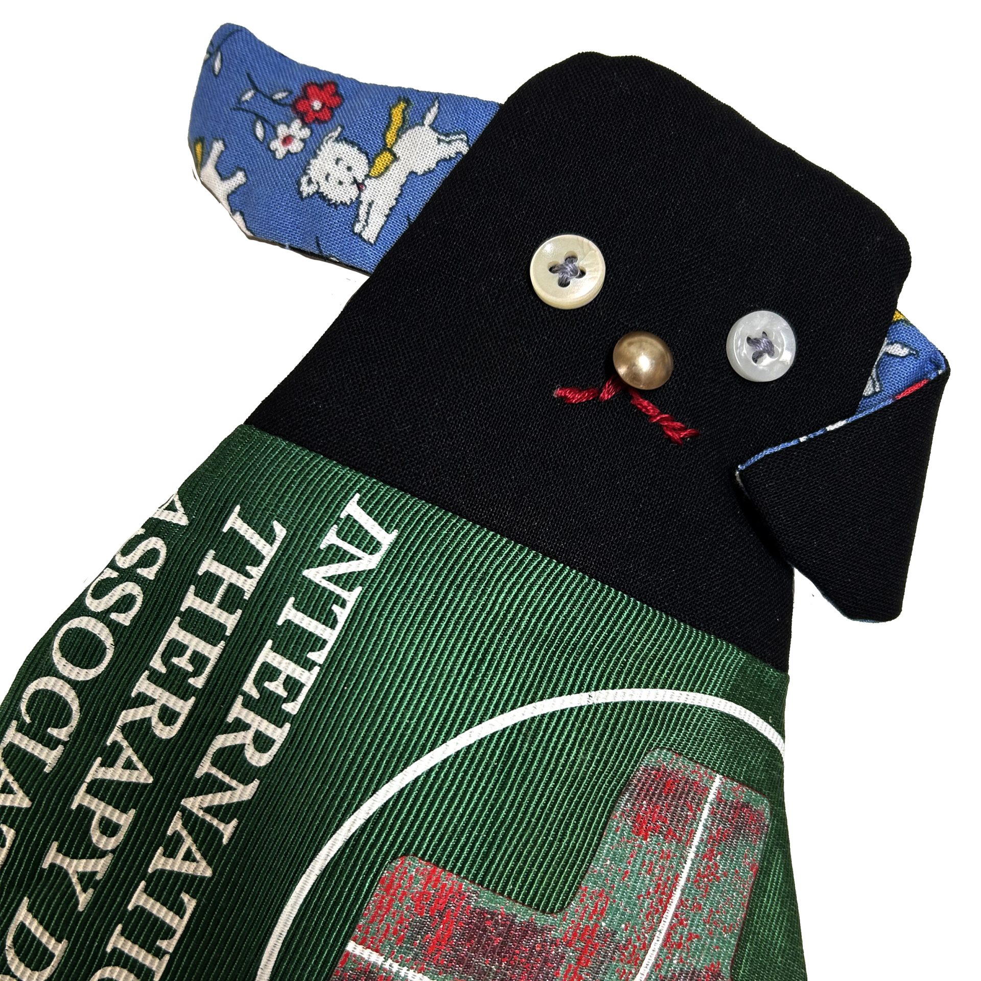 ブラックジャケットを本体に、アメリカの犬のプリントのヴィンテージコットンを耳の内側に、本体内側はブラックのコットンシャツで作りました。目にしたボタンはシャツのもの。鼻のボタンも、ヴィンテージの服から取りました。