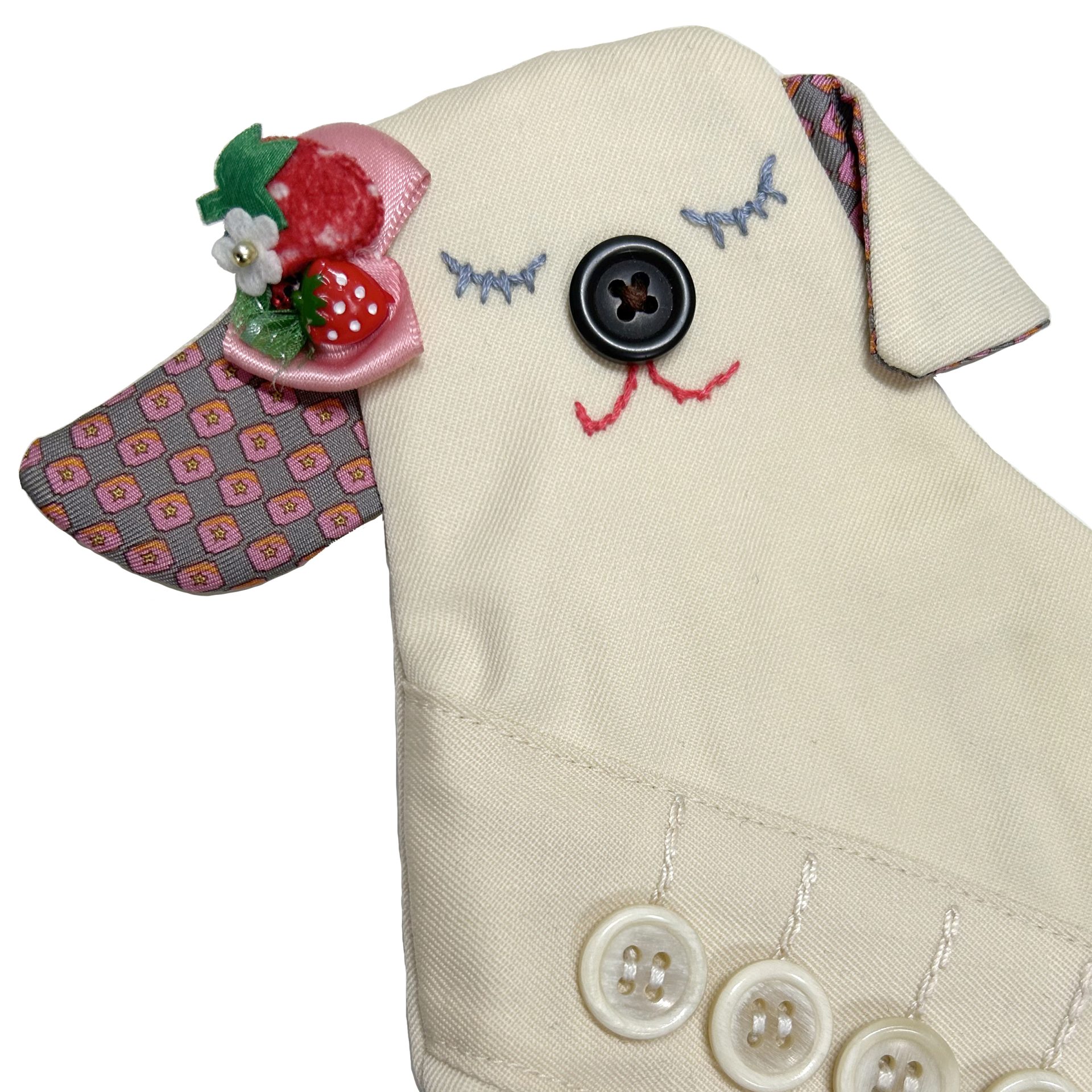 大木トオルさんのコンサート用のタキシードを本体に、シルクネクタイを耳の内側に、本体内側はドットジャカードのコットンシャツ、タキシードの袖口のボタンをそのまま前面にあしらっています。