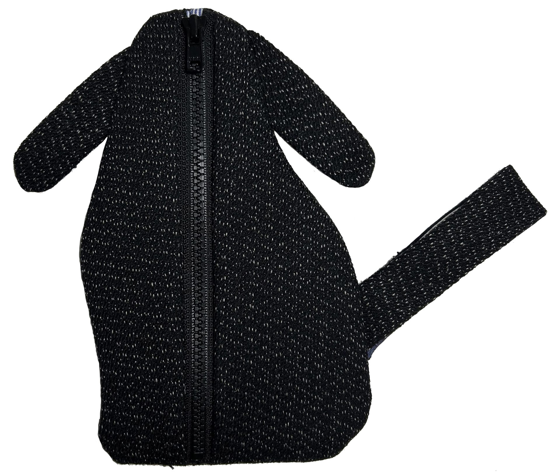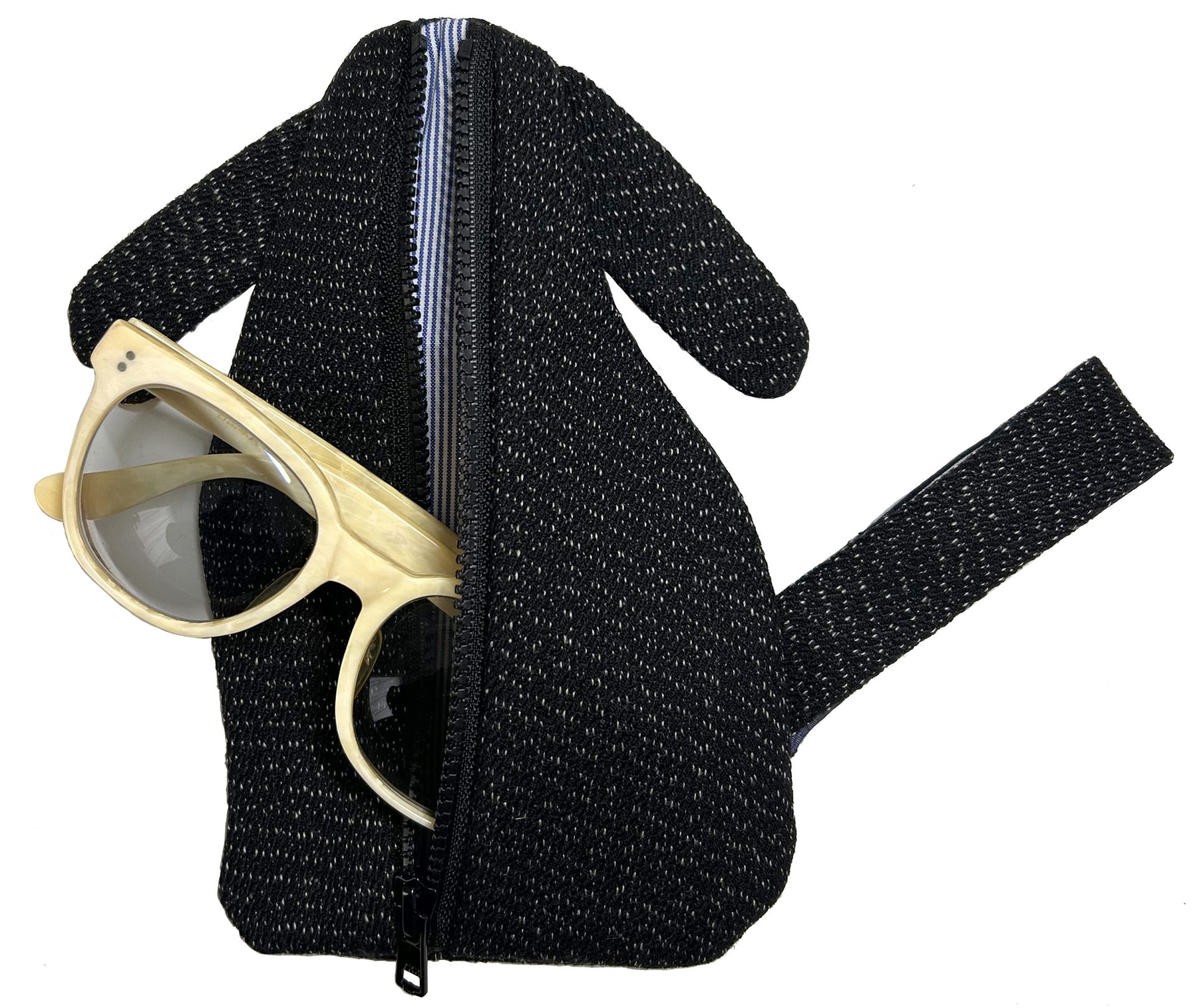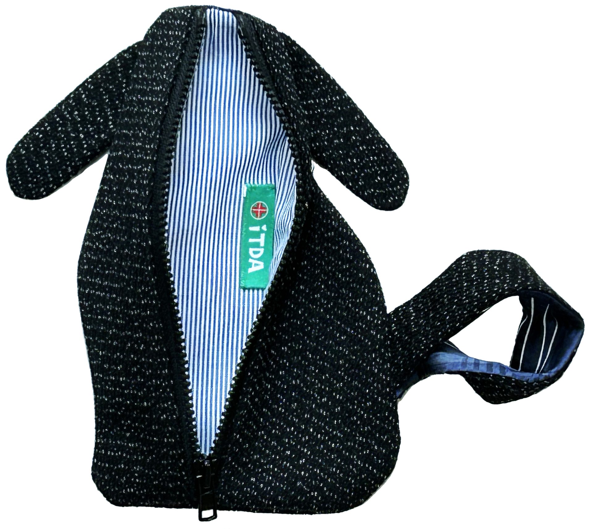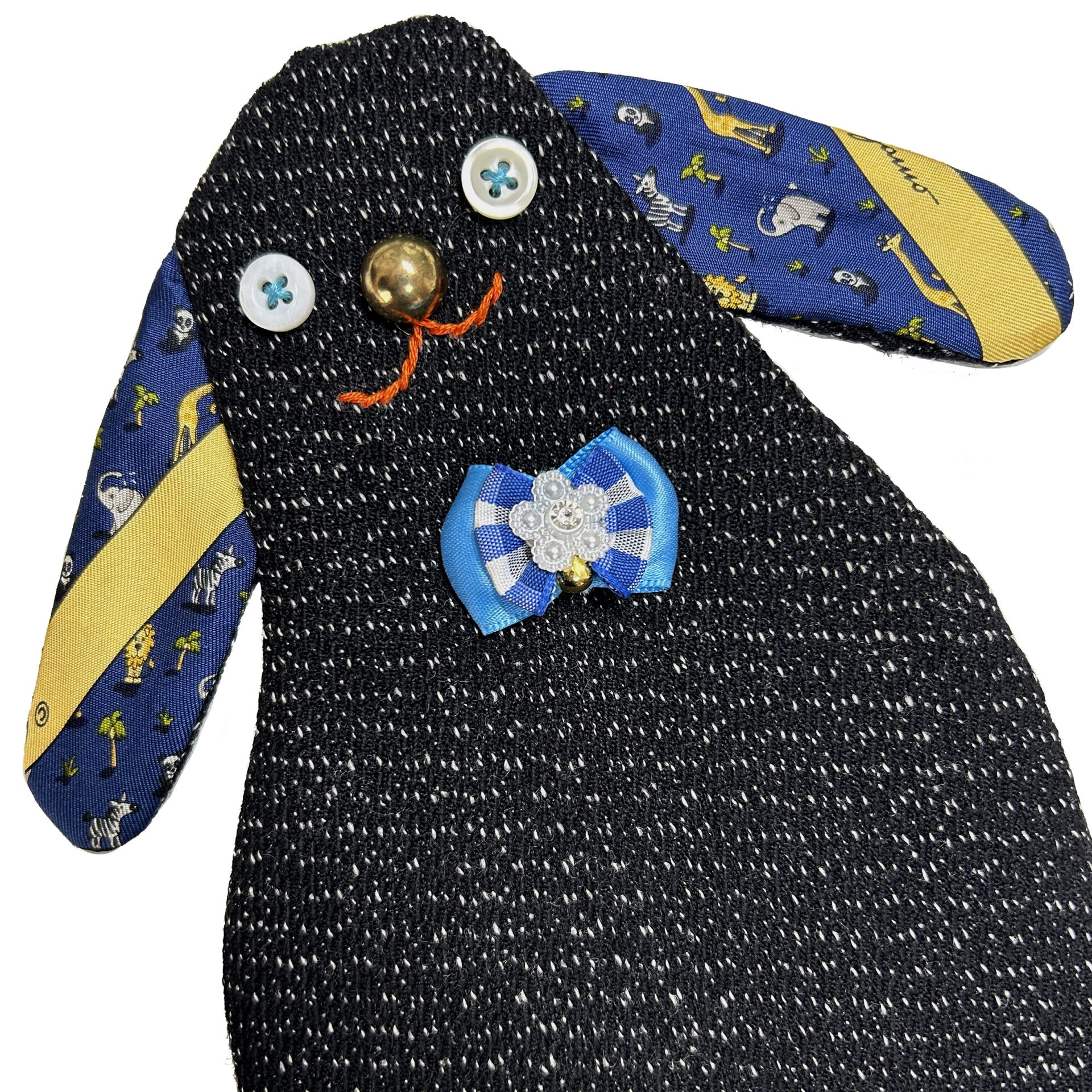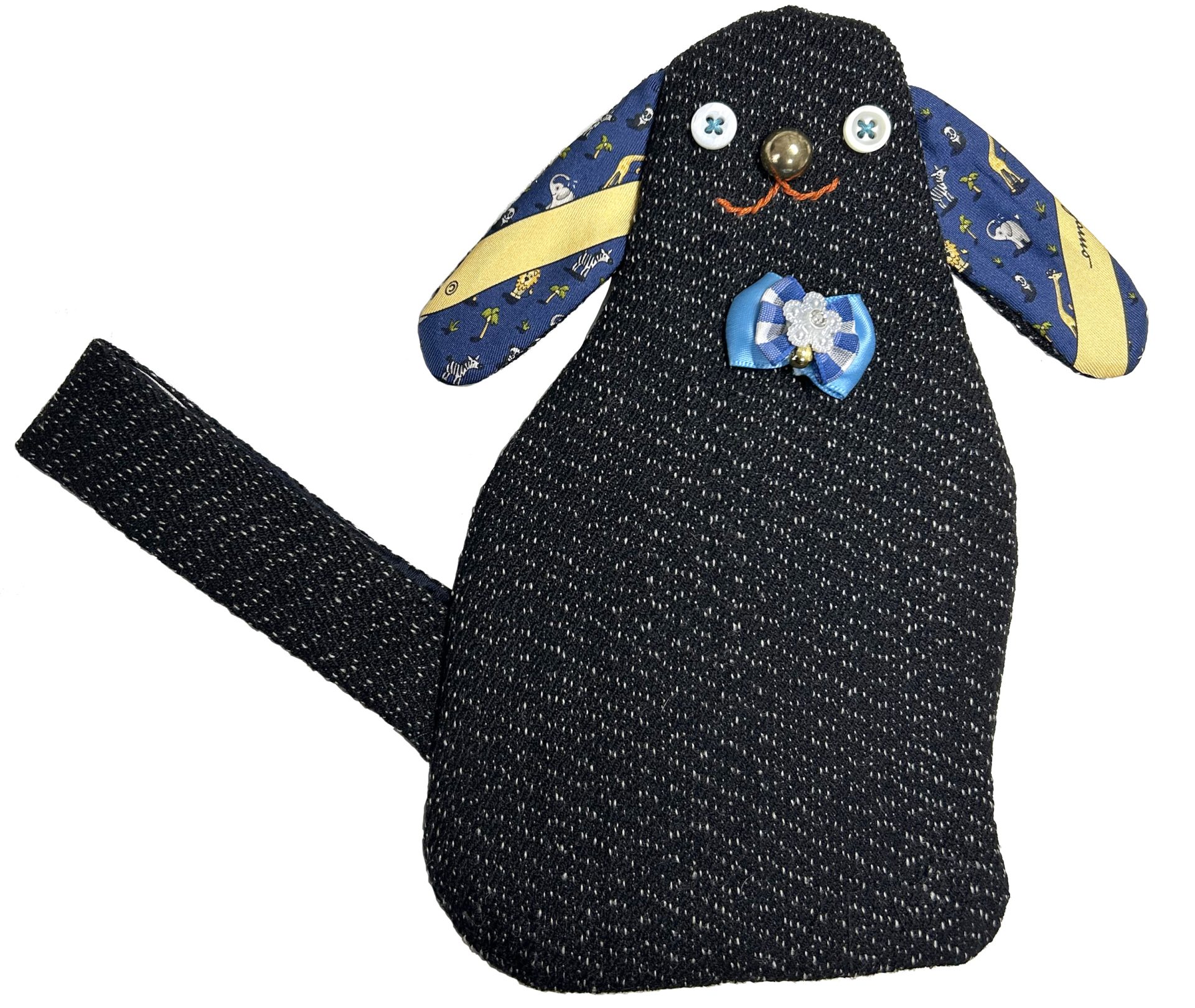 ウールツイードのスーツのパンツを本体に、トップメゾンのお茶目な動物プリントのネクタイを耳の内側に、本体内側はヒッコリーのコットンシャツで作りました。