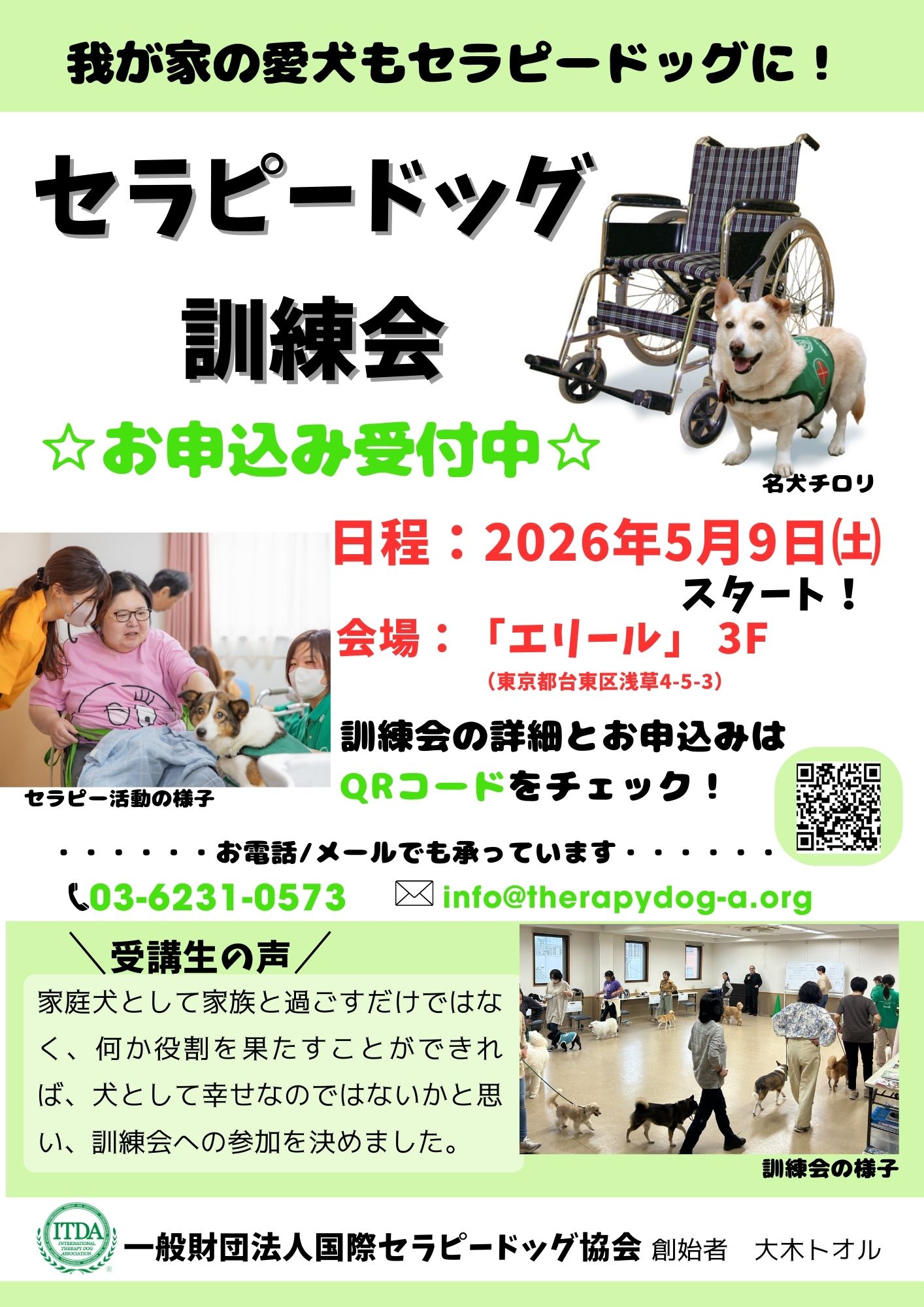 電話:03-6231-0573 メール:info@therapydog-a.org